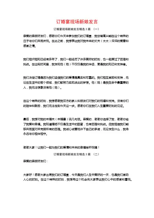订婚宴现场新娘发言订婚宴现场新娘发言精选3篇(一)亲爱的亲朋好友们,感谢你们今天来参加我们的订婚宴,我非常高兴能在这个特殊的日子与你们共同庆祝。