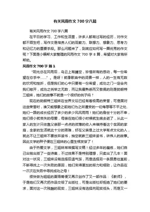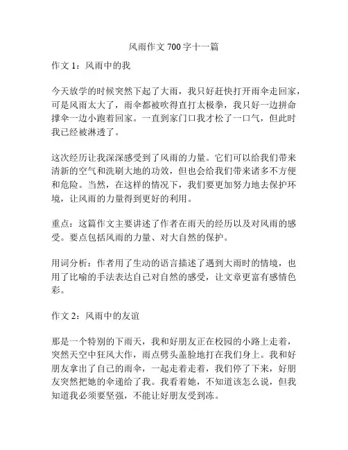 风雨作文700字精选十篇1. 风雨中的生活我非常喜欢听雨声和看雨水滴落在玻璃窗上,它们会排队下来,好像在讲故事。