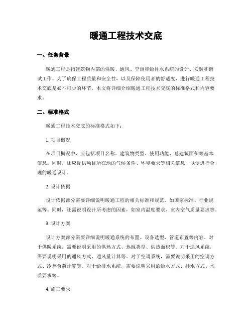 二、交底标准格式暖通工程安全技术交底的标准格式如下:1. 项目名称:填写暖通工程所属的项目名称。