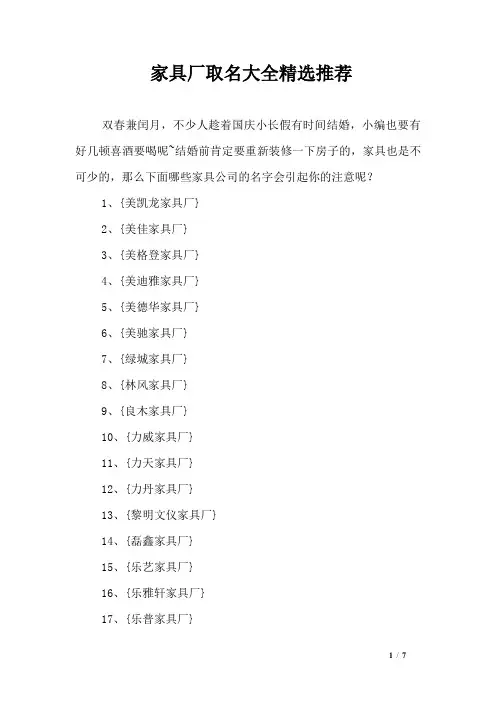 家具厂取名大全精选推荐双春兼闰月,不少人趁着国庆小长假有时间结婚,小编也要有好几顿喜酒要喝呢~结婚前肯定要重新装修一下房子的,家具也是不可少的,那么下面哪些家具公司的名字会引起你的注意呢?1、{美凯龙家具厂}2、{美佳家具厂}3、{美格登家具厂}4、{美迪雅家具厂}5、{美德华家具厂}6、{美驰家具厂}7、{绿城家具厂}8、{林风家具厂}9、{良木家具厂}10、{力威家具厂}11、{力天家具厂}12、{力丹家具厂}13、{黎明文仪家具厂}14、{磊鑫家具厂}15、{乐艺家具厂}16、{乐雅轩家具厂}17、{乐普家具厂}19、{可蒙迪家具厂}20、{康亿家家具厂}21、{康宝家具厂}22、{凯悦家具厂}23、{凯仕顿家具厂}24、{凯恩家具厂}25、{凯迪家具厂}26、{巨豪家具厂}27、{居陶然家具厂}28、{景华家具厂}29、{京拓隆家具厂}30、{京碧家具厂}31、{金索泰家具厂}32、{金瑞飞云家具厂}33、{金凯豪家具厂}34、{金鸿家具厂}35、{金富轩家具厂}36、{金得利家具厂}37、{杰特家具厂}38、{建泰家具厂}39、{嘉利信得家具厂}41、{嘉和家具厂}42、{嘉禾家具厂}43、{嘉德利家具厂}44、{嘉百利家具厂}45、{吉盛伟邦家具厂}46、{吉荣家具厂}47、{汇龙家具厂}48、{幻想空间家具厂}49、{华艺家具厂}50、{华腾家具厂}51、{华泰家具厂}52、{华荣家具厂}53、{华欧家具厂}54、{华南家具厂}55、{华美家具厂}56、{华科家具厂}57、{华邦家具厂}58、{鸿裕达家具厂}59、{鸿利博雅家具厂}60、{鸿基家具厂}61、{宏星家具厂}63、{宏澳家具厂}64、{红苹果家具厂}65、{红嘉家具厂}66、{恒友家具厂}67、{恒信家具厂}68、{恒为家具厂}69、{恒威家具厂}70、{恒荣家具厂}71、{恒丰家具厂}72、{浩轩家具厂}73、{昊特家具厂}74、{豪越家具}75、{豪强家具厂}76、{海鹏家具厂}77、{国安佳美家具厂}78、{广美家具厂}79、{光润家具厂}80、{冠品家具厂}81、{格利邦家具厂}82、{格莱德家具厂}83、{高点家具厂}85、{富通家具厂}86、{富利雅家具厂}87、{富丽家具厂}88、{富佳家具厂}89、{富华家具厂}90、{富尔邦家具厂}91、{富邦家具厂}92、{福溢家具厂}93、{丰恒家具厂}94、{飞凡家具厂}95、{恩爵家具厂}96、{东盛家具厂}97、{东恒升家具厂}98、{东方百盛家具厂}99、{东达红木家具厂} 100、{鼎兴家具厂} 101、{鼎立家具厂} 102、{鼎光家具厂} 103、{顶鼎装家具厂} 104、{帝益居家具厂} 105、{帝豪家私家具厂}107、{德美家具厂} 108、{德辉家具厂} 109、{道森家具厂} 110、{大康家具厂} 111、{春雷家具厂} 112、{创品家具厂} 113、{常德创美家具厂} 114、{昌盛家具厂} 115、{渤泰家具厂} 116、{博雅家具厂} 117、{博维家具厂} 118、{博森特家具厂} 119、{博励家具厂} 120、{博菲家具厂} 121、{博德家具厂} 122、{博盎家具厂} 123、{标致家具厂} 124、{栢丽家具厂} 125、{柏天尼家具厂} 126、{柏瑞朗家具厂} 127、{澳珀家具厂}129、{安耐家具厂} 130、{爱依瑞斯家具厂} 131、{艾斯特家具厂} 132、{ 赤慕家具厂}。