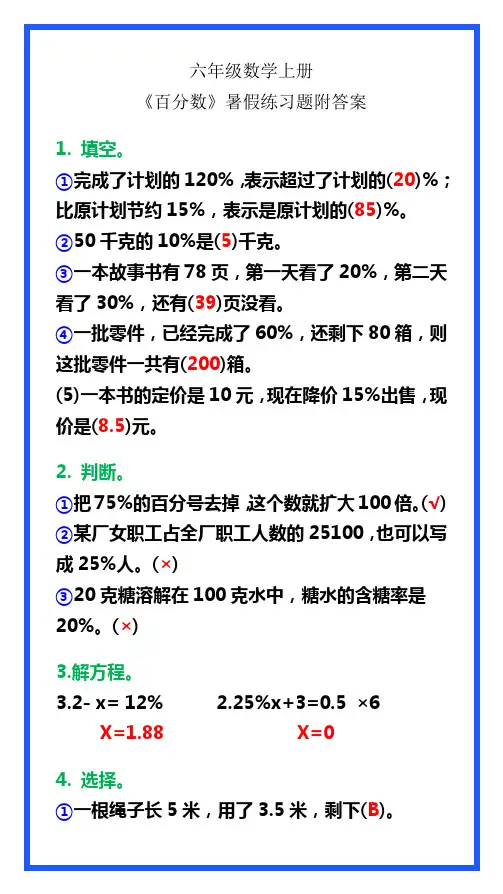 六年级数学上册《百分数》暑假练习题附答案1. 填空。