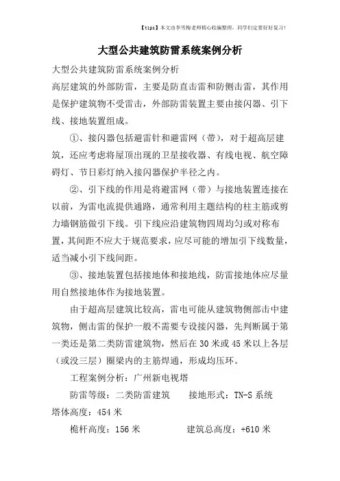 一、建筑物雷电事故案例分析1.1 XX大厦雷击事故XX大厦是一幢较高的建筑物,其屋顶缺乏有效的防雷措施。