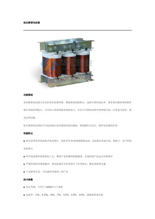 性能特点■铁芯采用优质低损耗冷轧硅钢片,绕组采用H级绝缘铜漆包线,电抗器具有温升低,损耗小,电气性能高的特点■科学的浸漆和热烘固化工艺,确保产品的整体机械强度,有效控制产品运行时的噪音■严格控制的电感量偏差,使电抗器在补偿系统中工作更稳定,避免谐振和过载■产品种类丰富,可以提供单相和三相产品技术参数■电压等级:可用于1000V以下系统■电抗率:1%、4.5%、6%、7%、12%、13%、14%,或根据要求定制■过电流能力:1.35In■最大线性电流:1.8In■额定绝缘水平:3KV 1min■电感量偏差:0~+3%■绝缘等级:F级或H级■防护等级:IP00使用环境■安装场所:户内■环境温度:-30℃~+45℃■通风良好:装在柜内时应加装通风设备■海拔高度:不超过1500m, 更高海拔需定制■相对湿度:不超过90%低压滤波电抗器功能描述低压滤波电抗器与滤波电容器串联组成无源滤波器,选择合理的电抗率,使串联回路的调谐频率接近谐波频率,对该谐波呈现较低的阻抗,从而吸收谐波,起到滤波的作用。