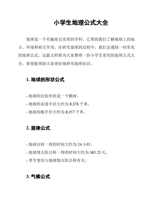 这篇文档将为大家整理一份小学生常用的地理公式大全,希望能帮助大家更好地研究地理知识。