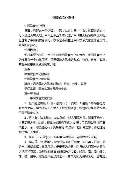 重点:中国饮食文化的特点中国饮食文化的发展难点:记忆各地方风味的形成、特点、分支、名菜记忆掌握中国著名面点及风味小吃第一节概述一、中国饮食文化发展1.最早的是有巢氏(旧石器时代):贡献:A造巢 B积鸟兽之肉聚草木之实,但当时人们不懂人工取火和熟食。