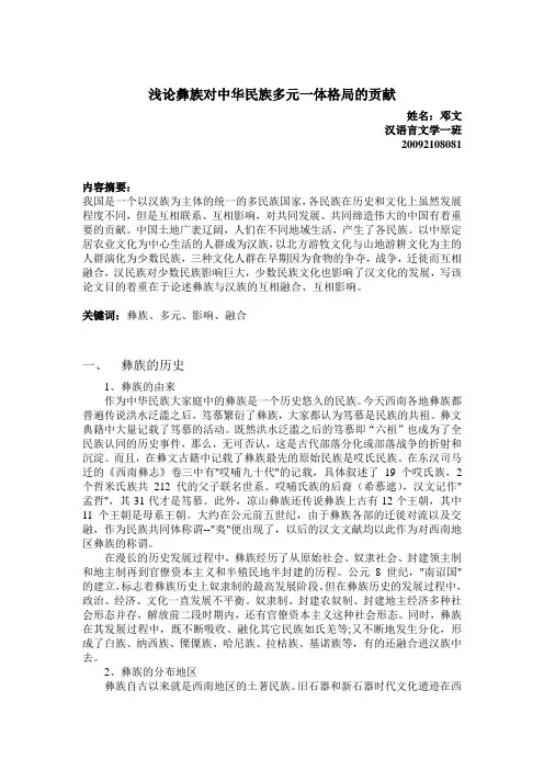 浅论彝族对中华民族多元一体格局的贡献姓名:邓文汉语言文学一班20092108081内容摘要:我国是一个以汉族为主体的统一的多民族国家,各民族在历史和文化上虽然发展程度不同,但是互相联系、互相影响,对共同发展、共同缔造伟大的中国有着重要的贡献。