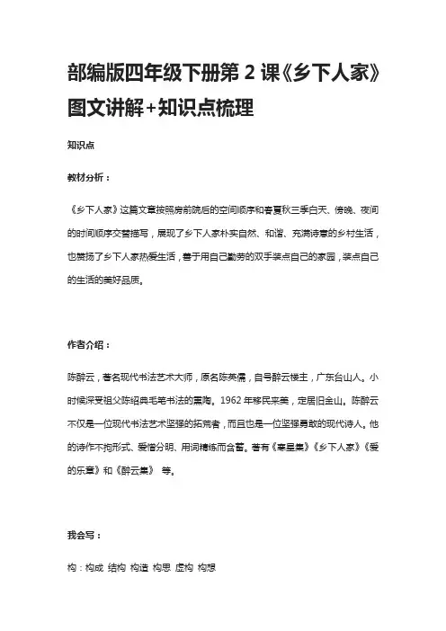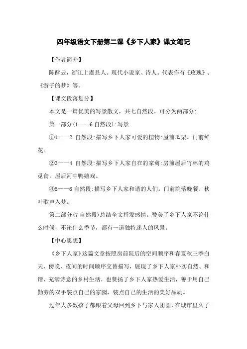 教材版本:统部编版四年级下册第2课《乡下人家》课文预习和知识点总结课文:第2课《乡下人家》年级:小学语文四年级下册学习日期:目录第2课《乡下人家》课文原文(教材文字版) (2)第2课《乡下人家》课文知识点梳理总结 (6)第2课《乡下人家》课文原文(教材图文版) (15)第2课《乡下人家》同步练习及答案 (22)教材课文原文预习文字版乡下人家总爱在屋前搭一瓜架,或种南瓜,或种丝瓜,让那些瓜藤攀上棚架,爬上屋檐。