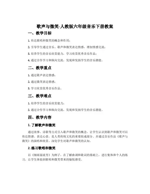 五、教学步骤:1. 导入:教师播放歌曲《歌声与微笑》,引导学生感受歌曲的魅力。