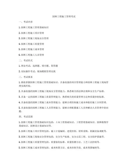 园林工程施工管理考试一、考试内容1. 园林工程施工管理基础知识2. 园林工程施工项目管理3. 园林工程施工现场安全管理4. 园林工程施工质量管理5. 园林工程施工成本管理6. 园林工程施工人员管理二、考试形式1. 理论考试:选择题、填空题、简答题2. 实际操作考试:现场模拟管理实践三、考试要求1. 熟练掌握园林工程施工管理基础知识,具备较强的项目管理能力和园林工程施工现场管理实践经验。