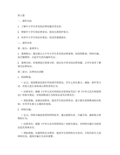 第1篇一、课件目标1. 了解中小学生常见的法律问题及其危害。