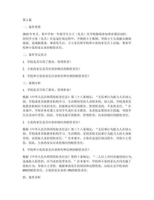第1篇一、案件背景2018年9月,某中学初一年级学生小王(化名)在学校操场参加体育课活动时,因同学小张(化名)在追逐打闹过程中,不慎将小王推倒,导致小王头部撞击操场地面,造成脑震荡。