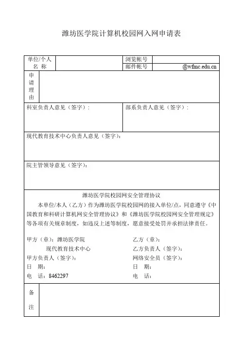 计算机入网申请表一、个人信息1、姓名:_____2、所在部门:_____3、职位:_____4、联系电话:_____5、电子邮箱:_____二、计算机信息1、计算机品牌及型号:_____2、操作系统版本:_____3、计算机 MAC 地址:_____4、 IP 地址(如有):_____三、入网用途1、工作用途(请详细说明工作内容和所需使用的网络资源):例如:需要访问公司内部的文件服务器,进行日常的文件传输和共享;使用特定的工作软件,与团队成员进行远程协作等。