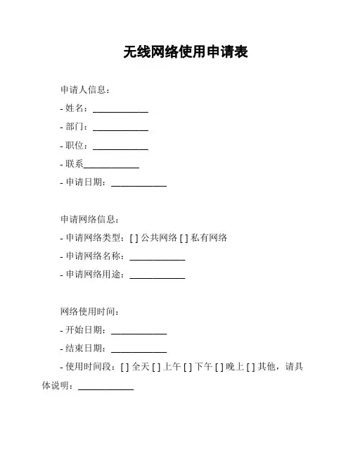 以上是一份无线网络使用申请表的模板,您可以根据实际情况进行适当修改和填写。