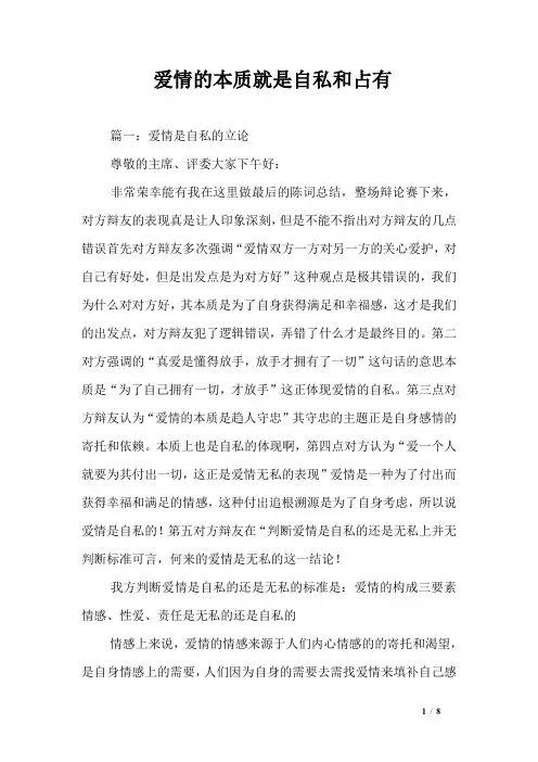 爱情的本质就是自私和占有篇一:爱情是自私的立论尊敬的主席、评委大家下午好:非常荣幸能有我在这里做最后的陈词总结,整场辩论赛下来,对方辩友的表现真是让人印象深刻,但是不能不指出对方辩友的几点错误首先对方辩友多次强调“爱情双方一方对另一方的关心爱护,对自己有好处,但是出发点是为对方好”这种观点是极其错误的,我们为什么对对方好,其本质是为了自身获得满足和幸福感,这才是我们的出发点,对方辩友犯了逻辑错误,弄错了什么才是最终目的。