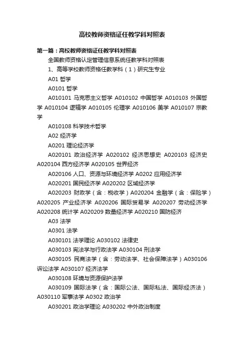 高校教师资格证任教学科对照表第一篇:高校教师资格证任教学科对照表全国教师资格认定管理信息系统任教学科对照表1、高等学校教师资格任教学科(1)研究生专业A01 哲学A0101 哲学A010101 马克思主义哲学 A010102 中国哲学 A010103 外国哲学 A010104 逻辑学 A010105 伦理学 A010106 美学 A010107 宗教学A010108 科学技术哲学A02 经济学A0201 理论经济学A020101 政治经济学A020102 经济思想史A020103 经济史A020104 西方经济学 A020105 世界经济A020106 人口、资源与环境经济学 A0202 应用经济学A020201 国民经济学 A020202 区域经济学A020203 财政学(含:税收学)A020204 金融学(含:保险学)A020205 产业经济学A020206 国际贸易学A020207 劳动经济学A020208 统计学 A020209 数量经济学 A020210 国防经济A03 法学A0301 法学A030101 法学理论 A030102 法律史A030103 宪法学与行政法学 A030104 刑法学A030105 民商法学(含:劳动法学、社会保障法学)A030106 诉讼法学 A030107 经济法学A030108 环境与资源保护法学A030109 国际法学(含:国际公法、国际私法、国际经济法)A030110 军事法学 A0302 政治学A030201 政治学理论 A030202 中外政治制度A030203 科学社会主义与国际共产主义运动A030204 中共党史(含:党的学说与党的建设)A030205 马克思主义理论与思想政治教育 A030206 国际政治 A030207 国际关系 A030208 外交学 A0303 社会学A030301 社会学 A030302 人口学 A030303 人类学A030304 民俗学(含:中国民间文学)A0304 民族学 A030401 民族学A030402 马克思主义民族理论与政策A030403 中国少数民族经济 A030404 中国少数民族史 A030405 中国少数民族艺术A04 教育学A0401 教育学A040101 教育学原理 A040102 课程与教学论 A040103 教育史A040104 比较教育学A040105 学前教育学A040106 高等教育学A040107 成人教育学 A040108 职业技术教育学 A040109 特殊教育学A040110 教育技术学(可授教育学、理学学位)A0402 心理学(可授教育学、理学学位)A040201 基础心理学A040202 发展与教育心理学 A040203 应用心理学 A0403 体育学A040301 体育人文社会学A040302 运动人体科学(可授教育学、理学、医学学位)A040303 体育教育训练学 A040304 民族传统体育学A05 文学A0501 中国语言文学A050101 文艺学A050102 语言学及应用语言学 A050103 汉语言文字学 A050104 中国古典文献学 A050105 中国古代文学 A050106 中国现当代文学A050107 中国少数民族语言文学(分语族)A050108 比较文学与世界文学 A0502 外国语言文学A050201 英语语言文学 A050202 俄语语言文学 A050203 法语语言文学 A050204 德语语言文学 A050205 日语语言文学 A050206 印度语言文学 A050207 西班牙语语言文学 A050208 阿拉伯语语言文学 A050209 欧洲语言文学 A050210 亚非语言文学A050211 外国语言学及应用语言学 A0503 新闻传播学A050301 新闻学 A050302 传播学 A0504 艺术学A050401 艺术学 A050402 音乐学 A050403 美术学 A050404 设计艺术学 A050405 戏剧戏曲学 A050406 电影学A050407 广播电视艺术学 A050408 舞蹈学A06 历史学A0601 历史学A060101 史学理论及史学史A060102 考古学及博物馆学A060103 历史地理学A060104 历史文献学(含:敦煌学、古文字学)A060105 专门史 A060106 中国古代史 A060107 中国近现代史 A060108 世界史A07 理学A0701 数学A070101 基础数学 A070102 计算数学A070103 概率论与数理统计 A070104 应用数学A070105 运筹学与控制论 A0702 物理学A070201 理论物理A070202 粒子物理与原子核物理A070203 原子与分子物理A070204 等离子体物理A070205 凝聚态物理A070206 声学A070207 光学A070208 无线电物理 A0703 化学A070301 无机化学 A070302 分析化学 A070303 有机化学A070304 物理化学(含:化学物理)A070305 高分子化学与物理 A0704 天文学A070401 天体物理A070402 天体测量与天体力学 A0705 地理学A070501 自然地理学 A070502 人文地理学A070503 地图学与地理信息系统 A0706 大气科学A070601 气象学A070602 大气物理学与大气环境 A0707 海洋科学A070701 物理海洋学 A070702 海洋化学 A070703 海洋生物学A070704 海洋地质 A0708 地球物理学A070801 固体地球物理学 A070802 空间物理学 A0709 地质学A070901 矿物学、岩石学、矿床学 A070902 地球化学A070903 古生物学与地层学(含:古人类学)A070904 构造地质学 A070905 第四纪地质学 A0710 生物学A071001 植物学 A071002 动物学 A071003 生理学A071004 水生生物学 A071005 微生物学 A071006 神经生物学A071007 遗传学 A071008 发育生物学 A071009 细胞生物学A071010 生物化学与分子生物学 A071011 生物物理学 A071012 生态学 A0711 系统科学A071101 系统理论A071102 系统分析与集成A0712 科学技术史(分学科,可授理学、工学、农学、医学学位)A08 工学A0801 力学(可授工学、理学学位)A080101 一般力学与力学基础 A080102 固体力学 A080103 流体力学 A080104 工程力学 A0802 机械工程A080201 机械制造及其自动化 A080202 机械电子工程 A080203 机械设计及理论 A080204 车辆工程 A0803 光学工程A0804 仪器科学与技术A080401 精密仪器及机械 A080402 测试计量技术及仪器 A0805 材料科学与工程A080501 材料物理与化学 A080502 材料学A080503 材料加工工程 A0806 冶金工程A080601 冶金物理化学 A080602 钢铁冶金 A080603 有色金属冶金 A0807 动力工程及工程热物理A080701 工程热物理 A080702 热能工程A080703 动力机械及工程A080704 流体机械及工程A080705 制冷及低温工程 A080706 化工过程机械 A0808 电气工程A080801 电机与电器A080802 电力系统及其自动化A080803 高电压与绝缘技术A080804 电力电子与电力传动A080805 电工理论与新技术A0809 电子科学与技术(可授工学、理学