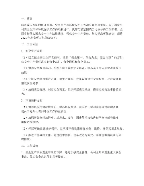 第1篇一、前言在过去的一年里,安环部在公司领导的正确指导下,紧紧围绕安全生产和环境保护两大主题,以科学发展观为指导,认真贯彻落实国家有关安全生产和环境保护的政策法规,努力提高全体员工的安全环保意识,加强安全环保管理,确保公司安全生产和环境保护工作的顺利进行。
