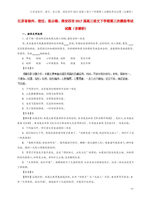 江苏省徐州、宿迁、连云港、淮安四市2017届高三语文下学期第三次模拟考试试题(含解析)一、语言文字运用1.在下面一段话的空缺处依次填入词语,最恰当的一组是诗,表达着语言的最高理想和生命的最区域。