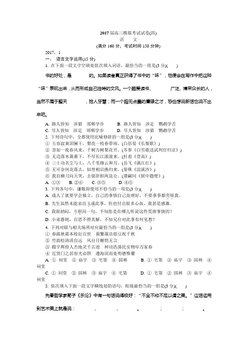 2017届高三模拟考试试卷(四)语文(满分160分,考试时间150分钟)2017.1一、语言文字运用(15分)1. 在下面一段文字空缺处依次填入词语,最恰当的一组是(3分)()书的好处,是________的。