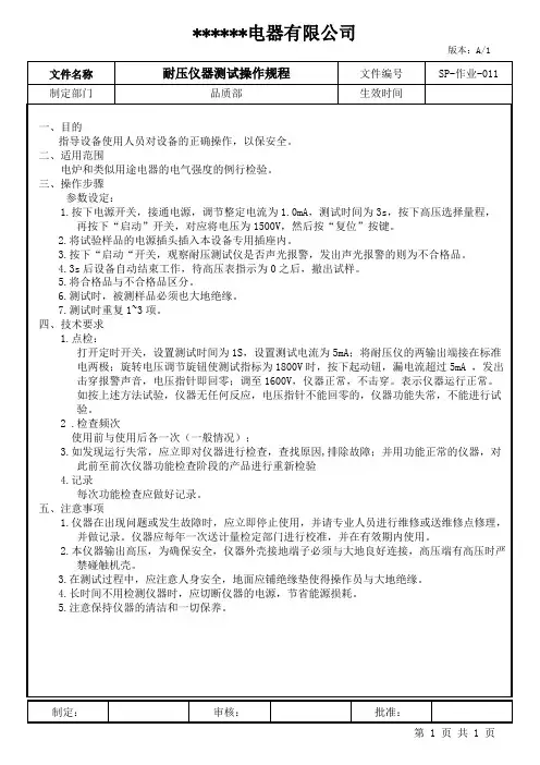 耐压测试仪操作规程《耐压测试仪操作规程》一、测试仪器准备1. 确保耐压测试仪器处于稳定状态,并连接到电源和地线。