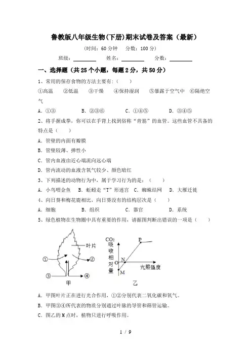 鲁教版八年级生物(下册)期末试卷及答案(最新)(时间:60分钟分数:100分)班级:姓名:分数:一、选择题(共25个小题,每题2分,共50分)1、常用的保存食物的方法主要有:()①高温②低温③干燥④保持湿润⑤暴露于空气中⑥隔绝空气A.①③B.②③⑥C.①④⑤D.③④⑤2、将手握成拳,你可以在手背上找到俗称“青筋”的血管。