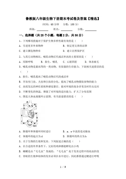 鲁教版八年级生物下册期末考试卷及答案【精选】(时间:60分钟分数:100分)班级:姓名:分数:一、选择题(共25个小题,每题2分,共50分)1、下列哪项措施对于保护生物多样性最有效的是()A.引进更多外来物种B.制定更完善的法律C.建立濒危物种库D.建立自然保护区2、与其它动物相比,哺乳动物后代成活率高的主要原因是()A.用肺呼吸B.胎生、哺乳C.心脏四腔D.体表被毛3、哺乳动物是最高等的一类动物,有很强的生存能力,下面相关述错误的是()A.胎生、哺乳提高了哺乳动物后代的成活率B.牙齿有门齿、犬齿和臼齿的分化,提高了哺乳动物摄取食物的能力C.高度发达的神经系统和感觉器官,能对环境的复杂多变及时作出反应D.不断变化的体温,增强了对环境的适应能力,扩大了分布范围4、图是人体血液循环示意图。