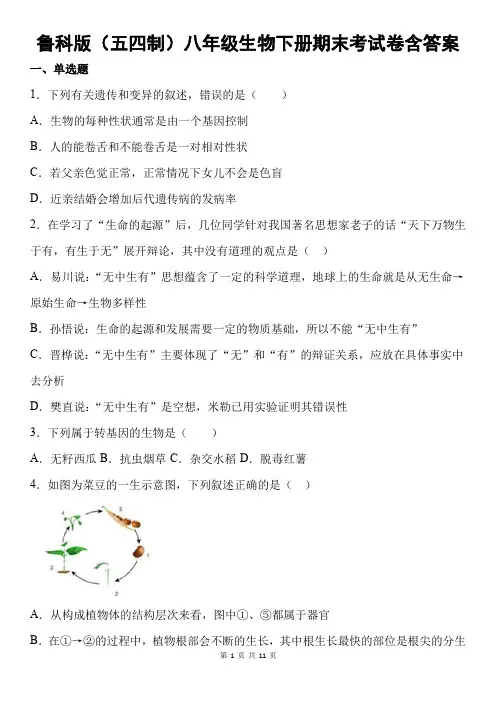 鲁科版(五四制)八年级生物下册期末考试卷含答案一、单选题1.下列有关遗传和变异的叙述,错误的是()A.生物的每种性状通常是由一个基因控制B.人的能卷舌和不能卷舌是一对相对性状C.若父亲色觉正常,正常情况下女儿不会是色盲D.近亲结婚会增加后代遗传病的发病率2.在学习了“生命的起源”后,几位同学针对我国著名思想家老子的话“天下万物生于有,有生于无”展开辩论,其中没有道理的观点是()A.易川说:“无中生有”思想蕴含了一定的科学道理,地球上的生命就是从无生命→原始生命→生物多样性B.孙悟说:生命的起源和发展需要一定的物质基础,所以不能“无中生有”C.晋桦说:“无中生有”主要体现了“无”和“有”的辩证关系,应放在具体事实中去分析D.樊直说:“无中生有”是空想,米勒已用实验证明其错误性3.下列属于转基因的生物是()A.无籽西瓜B.抗虫烟草C.杂交水稻D.脱毒红薯4.如图为菜豆的一生示意图,下列叙述正确的是()A.从构成植物体的结构层次来看,图中①、⑤都属于器官B.在①→②的过程中,植物根部会不断的生长,其中根生长最快的部位是根尖的分生区C.①→②过程所需要的有机物由胚乳提供D.⑤中有多颗菜豆是因为1朵花中有多个子房5.属于可遗传变异的是()A.一对正常夫妇生育了白化病女儿B.常练举重,胸肌发达C.肥料充足处的大豆植株高大D.常晒太阳,皮肤变黑6.下列关于人与动物生殖和发育的描述中正确的是 ( )A.家蚕发育过程与蝗虫相似,都经历卵、若虫、成虫三个阶段B.蝌蚪与成蛙的形态结构和生活习性区别很大,这种发育属于完全变态C.人的受精卵进入子宫后才开始进行细胞分裂D.不是所有的鸟卵都能孵化出雏鸟7.生物学在现代人类社会的各个领域发挥着重要作用,下列各项生物技术对现代生活所起的作用,描述错误的是()A.生态农业(例如果园养鸡),能够保护和改善生态环境,提高农产品的安全性B.应用细胞核移植技术,能获得牛、羊等克隆动物C.杂交水稻,为解决世界粮食短缺问题作出了贡献D.试管婴儿,是在试管中诞生的婴儿,为解决不孕症提供了新思路8.下列各组性状,属于相对性状的是()A.豌豆的圆粒和黄粒B.番茄的红果和黄果C.兔的白毛和短毛D.人的蓝眼和双眼皮9.下列关于生物生殖和发育的叙述,正确的是()A.雌蛙鸣叫、雌雄蛙抱对等现象是青蛙的繁殖行为。