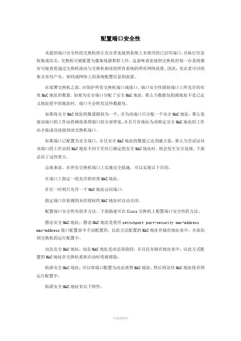 端口安全配置目录第1章端口安全 (2)1.1端口安全简介 (2)1.2端口安全配置 (2)第1章端口安全1.1 端口安全简介端口安全一般应用在接入层。