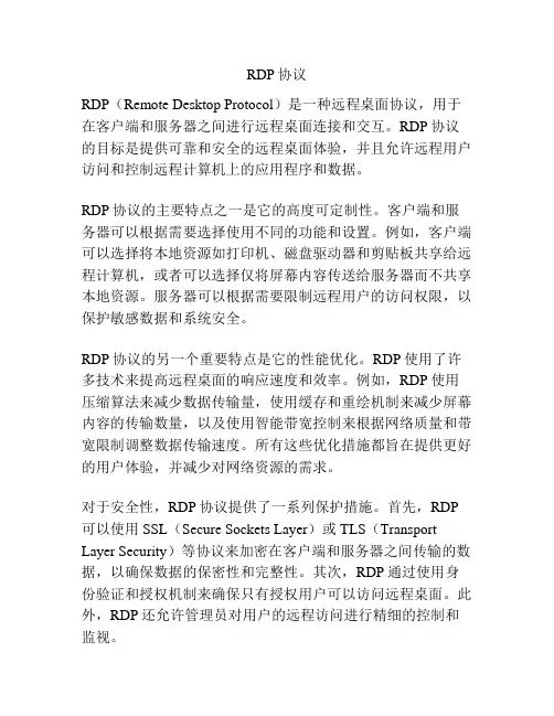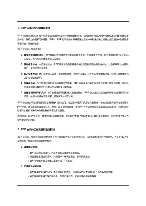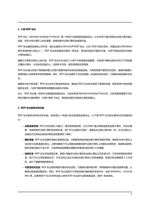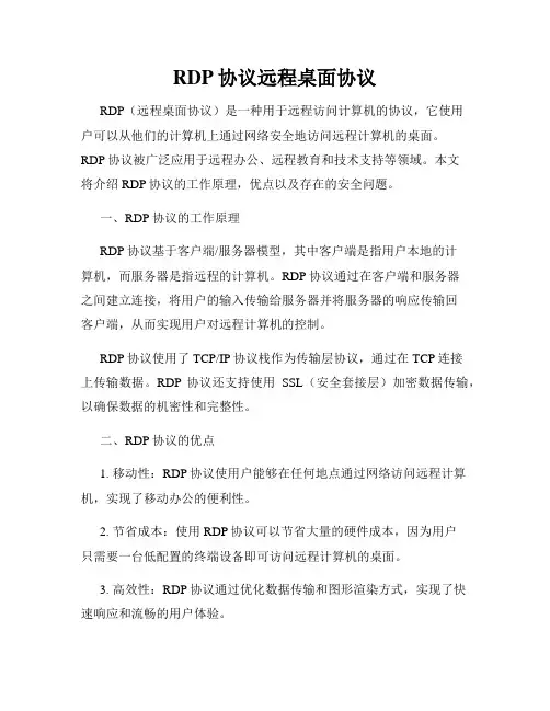 二、RDP协议的优点1. 移动性:RDP协议使用户能够在任何地点通过网络访问远程计算机,实现了移动办公的便利性。