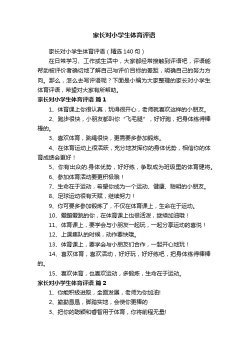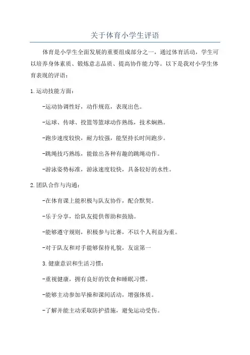 关于体育小学生评语体育是小学生必修的一门课程,通过体育锻炼可以促进小学生身体的健康发展,增强体质,培养团队合作意识和竞争意识。