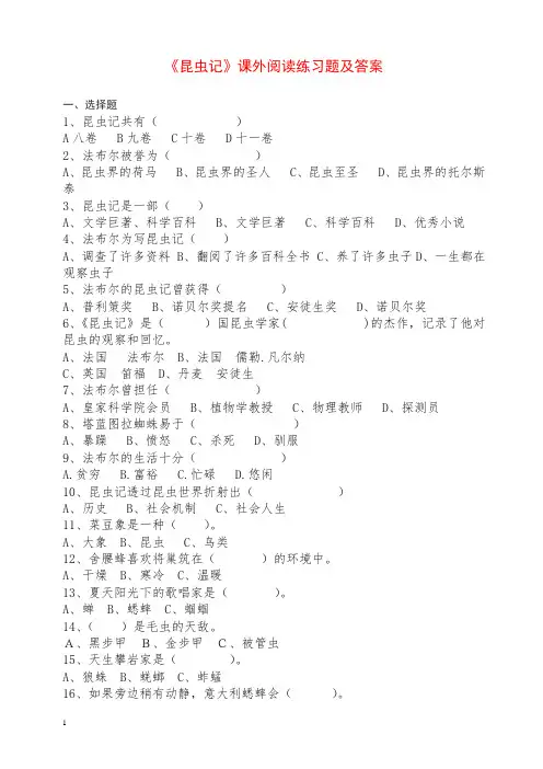 《昆虫记》课外阅读练习题及答案一、选择题1、昆虫记共有()A八卷 B九卷 C十卷 D十一卷2、法布尔被誉为()A、昆虫界的荷马B、昆虫界的圣人C、昆虫至圣D、昆虫界的托尔斯泰3、昆虫记是一部()A、文学巨著、科学百科B、文学巨著C、科学百科D、优秀小说4、法布尔为写昆虫记()A、调查了许多资料B、翻阅了许多百科全书C、养了许多虫子D、一生都在观察虫子5、法布尔的昆虫记曾获得()A、普利策奖B、诺贝尔奖提名C、安徒生奖D、诺贝尔奖6、《昆虫记》是()国昆虫学家( )的杰作,记录了他对昆虫的观察和回忆。