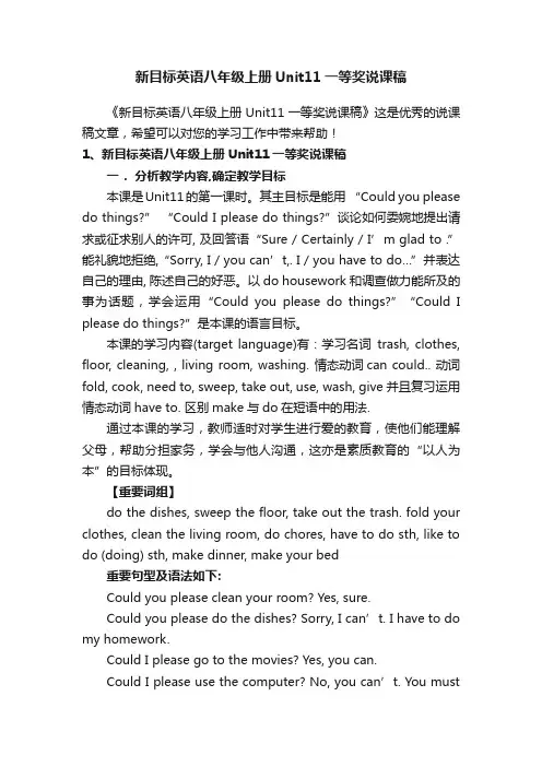 新目标英语八年级上册Unit11一等奖说课稿《新目标英语八年级上册Unit11一等奖说课稿》这是优秀的说课稿文章,希望可以对您的学习工作中带来帮助!1、新目标英语八年级上册Unit11一等奖说课稿一.分析教学内容,确定教学目标本课是Unit11的第一课时。