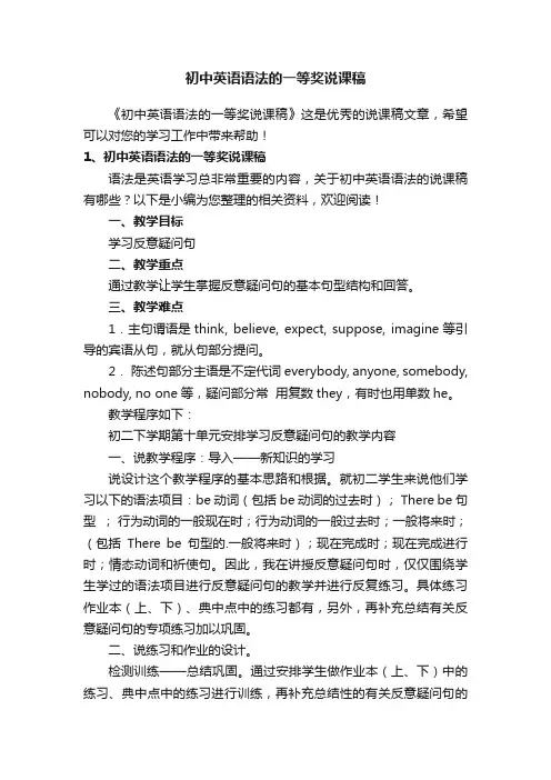 初中英语语法的一等奖说课稿《初中英语语法的一等奖说课稿》这是优秀的说课稿文章,希望可以对您的学习工作中带来帮助!1、初中英语语法的一等奖说课稿语法是英语学习总非常重要的内容,关于初中英语语法的说课稿有哪些?以下是小编为您整理的相关资料,欢迎阅读!一、教学目标学习反意疑问句二、教学重点通过教学让学生掌握反意疑问句的基本句型结构和回答。