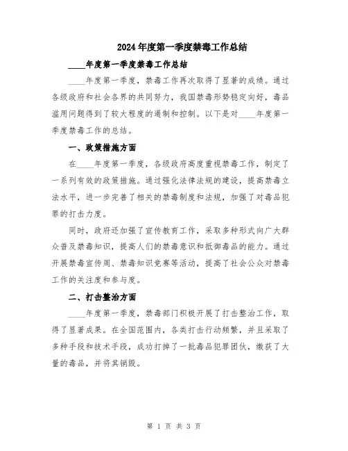 2024第一季度禁毒工作总结禁毒工作季度小结2024年第一季度禁毒工作总结自2024年年初至本季度末,我们深入贯彻习近平总书记关于禁毒工作的重要指示精神,始终坚持把禁毒工作作为一项重要的社会治理任务,坚决打击各类毒品犯罪活动,维护社会安全和人民群众生命财产安全。