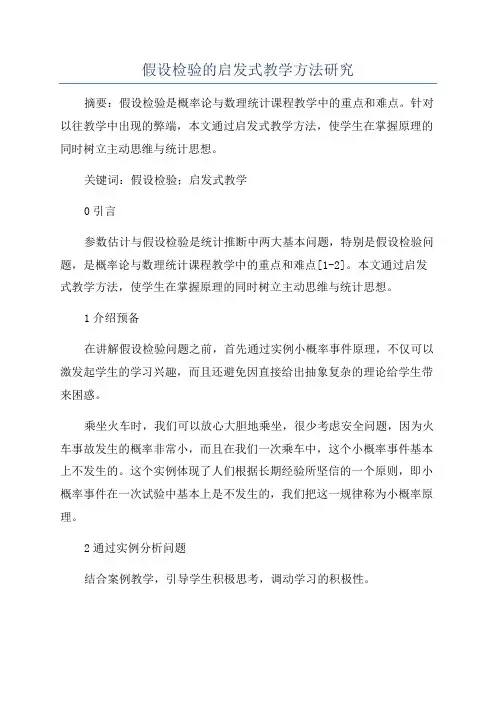 关键词:假设检验;启发式教学0引言参数估计与假设检验是统计推断中两大基本问题,特别是假设检验问题,是概率论与数理统计课程教学中的重点和难点[1-2]。