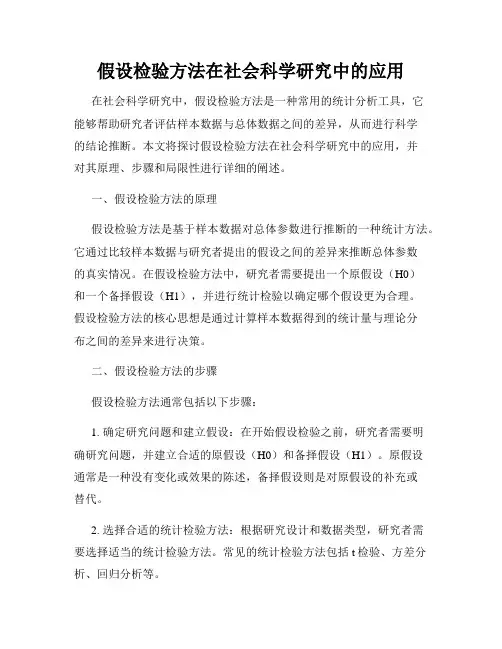 假设检验方法在社会科学研究中的应用在社会科学研究中,假设检验方法是一种常用的统计分析工具,它能够帮助研究者评估样本数据与总体数据之间的差异,从而进行科学的结论推断。