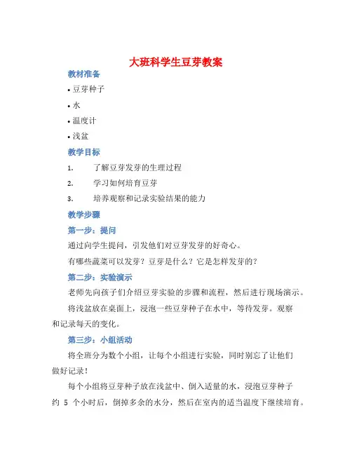 大班科学生豆芽教案教材准备•豆芽种子•水•温度计•浅盆教学目标1.了解豆芽发芽的生理过程2.学习如何培育豆芽3.培养观察和记录实验结果的能力教学步骤第一步:提问通过向学生提问,引发他们对豆芽发芽的好奇心。