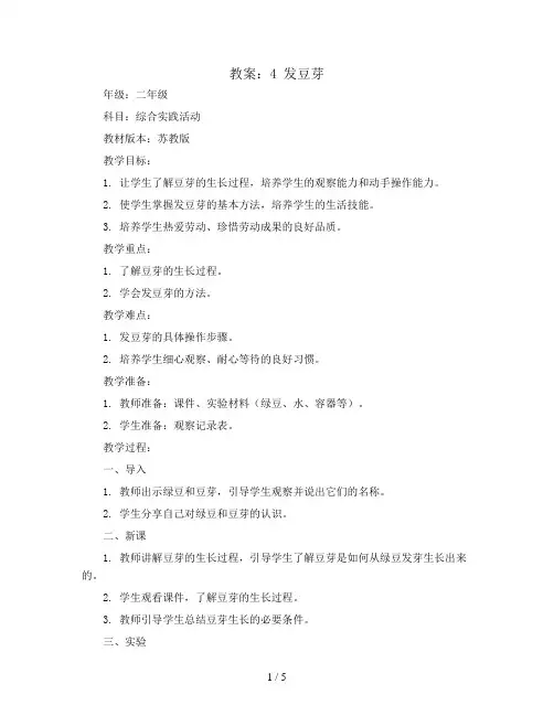 教案:4 发豆芽年级:二年级科目:综合实践活动教材版本:苏教版教学目标:1. 让学生了解豆芽的生长过程,培养学生的观察能力和动手操作能力。
