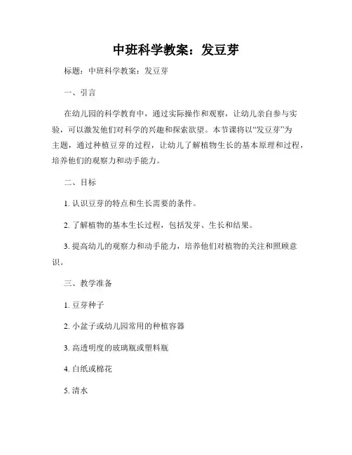 中班科学教案:发豆芽标题:中班科学教案:发豆芽一、引言在幼儿园的科学教育中,通过实际操作和观察,让幼儿亲自参与实验,可以激发他们对科学的兴趣和探索欲望。