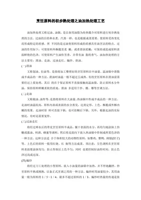 (一)滑油又称划油、拉油等,是指将加工整理好的烹饪原料在中油量、温油锅中滑散成半成品的一种方法。