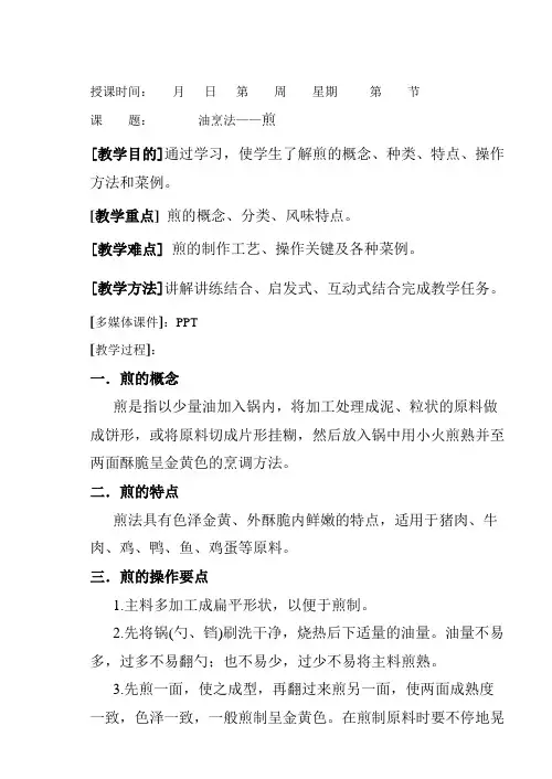 (二)煎烹1.概念煎烹是干煎与烹的结合,是原料经过干煎后,再烹入调味汁的一种烹调方法。