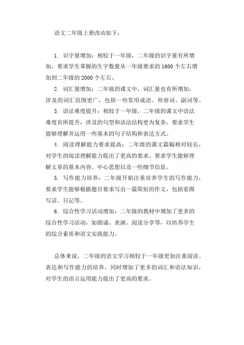 4. 阅读理解能力要求提高:二年级的课文篇幅相对较长,对学生的阅读理解能力提出了更高的要求。