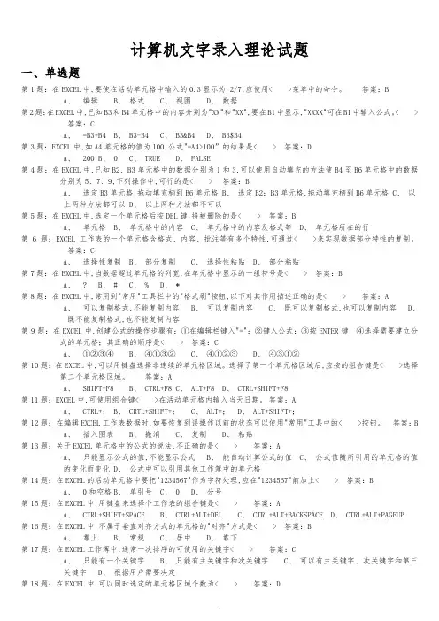 答案:CA、选择性复制B、部分复制C、选择性粘贴D、部分粘贴第7题:在EXCEL中,当数据超过单元格的列宽,在单元格中显示的一组符号是< > 答案:BA、?B、 #C、 %D、 *第8题:在EXCEL中,常用到"常用"工具栏中的"格式刷"按钮,以下对其作用描述正确的是< > 答案:AA、可以复制格式,不能复制内容B、可以复制内容C、既可以复制格式,也可以复制内容D、既不能复制格式,也不能复制内容第9题:在EXCEL中,创建公式的操作步骤有:①在编辑栏键入"=";②键入公式;③按ENTER键;④选择需要建立分式的单元格;其正确的顺序是< > 答案:CA、①②③④B、④①③②C、④①②③D、④③①②第10题:在EXCEL中,可以用键盘选择非连续的单元格区域。