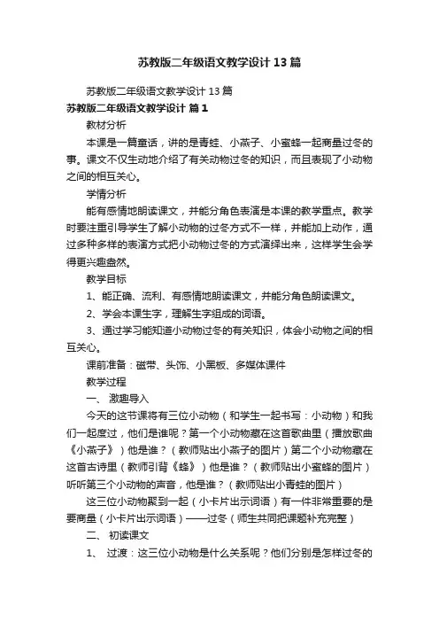 苏教版二年级语文教学设计13篇苏教版二年级语文教学设计13篇苏教版二年级语文教学设计篇1教材分析本课是一篇童话,讲的是青蛙、小燕子、小蜜蜂一起商量过冬的事。