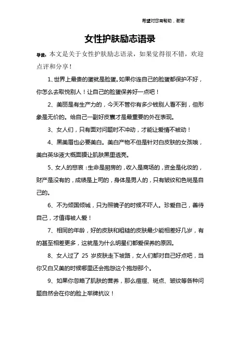 女性励志保养护肤语录女人爱美护肤励志语录女性励志保养护肤语录女人爱美护肤励志语录1)保养是女人一生必修课,不要感觉自己年轻就有恃无恐,你是否发现自己的皮肤越来越糟糕了。