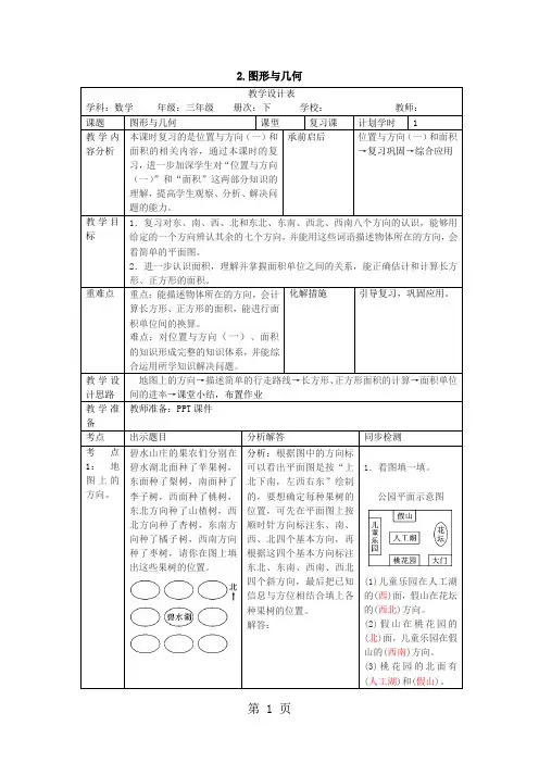 三年级下册数学教案总复习图形与几何|北师大版教案内容:一、教学内容本节课是北师大版三年级下册数学的总复习课,主要复习图形与几何的相关知识。