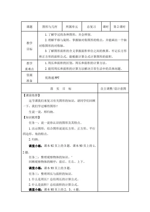 八、课后反思及拓展延伸课后反思:本节课通过复习图形与几何的知识,让学生巩固了平面图形和立体图形的特征,了解了图形的变换和位置关系,提高了学生解决实际问题的能力。