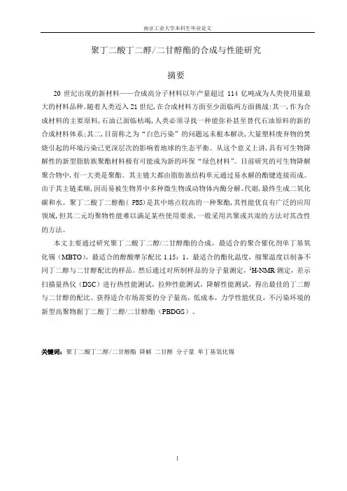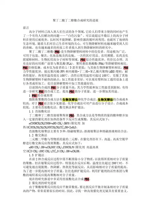 关键词:聚丁二酸丁,二醇酯;高分子量;扩链改性Gather succinic acid synthesis of butyl glycol estersAbstract: the succinic acid and butyl glycol as raw material, through the molten polycondensation succinic acid synthesis method of clustering butyl glycol esters. Through the HDI for extender chain modification, improve its degradation property and mechanical properties. The experimental results show that extender chain product drop, tensile strength, crystallinity was improved.key words:gather succinic acid, cubed diol esters; High molecular weight; Extender chain modification摘要:..................................................................................................................................................... I I ABSTRACT.. (III)前言 01 实验部分 01.1原料与试剂 01.2 (1)1.3测试与表征 (1)2 结果与讨论 (2)2.1PBS和EPBS的合成与结构表征 (2)2.2PBS和EPBS的性能 (3)2.2.1 热性能 (3)2.2.2 力学性能 (4)3 结论 (4)致谢 (6)前言脂肪族聚酯能完全生物降解材料,可代替传统石化塑料,减少碳排放。