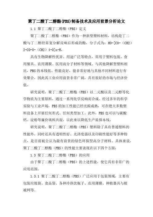 具体来说,聚丁二酸丁二醇酯(PBS)的性能主要表现在以下四个方面:1.3 聚丁二酸丁二醇酯(PBS)的应用由于聚丁二酸丁二醇酯(PBS)的上述性能,使它具有非常广的应用范围。