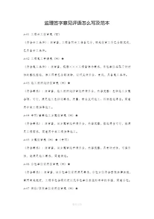 监理签字意见评语怎么写及范本A-01 工程开工报审表(W)(符合开工条件):经审查,工程各项开工准备充分,相关报审工作已全部完成,已具备开工条件。