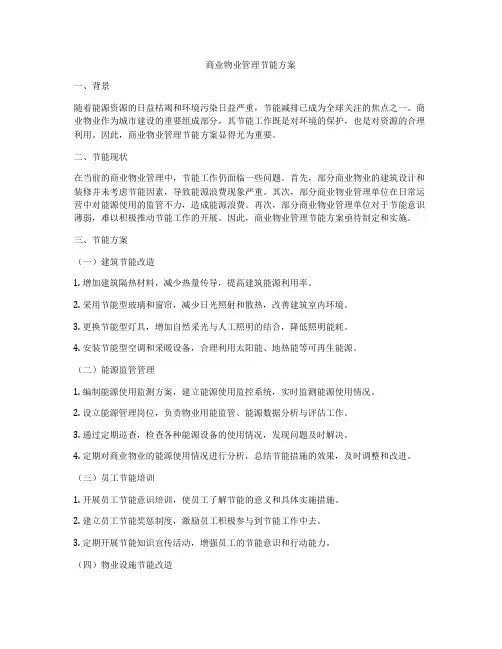 商业物业管理节能方案在目前社会强调节能环保的大背景下,商业物业管理也需要加入节能行列。